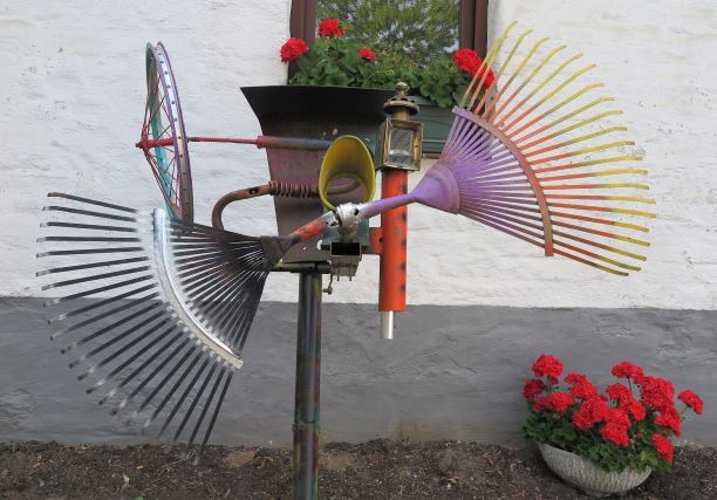 Lustig waren auch die Installationen von MITO, Michael Thomas, die einen im Innenhof des Köllenhofs empfingen. Aus diversen Gerätschaften baut er skurrile Objekte, teils mit beweglichen Elementen. Sein „FliWaTüt“ war so eines, das besonders amüsierte – „fliegt, wackelt, tütet“. Futurama-Fans dürfte seine „Gender-Bender“-Installation gefallen haben, mit der er das Thema Gendern in die Science-Fiction-Welt transponierte.