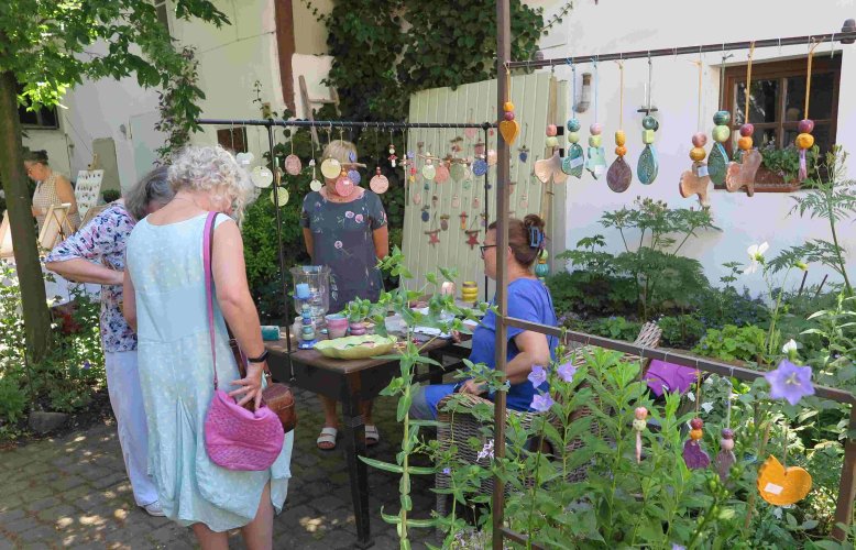 Die Besucherinnen und Besucher waren aber auch begeistert von ihren asiatisch angehauchten Dosen, Seifenschalen, Kerzenleuchtern, Mohnblüten, Kugeln und den im kleinen Gärtchen versteckten Stelen und Figuren. Schwamm da wirklich ein „Fisch“ durchs üppige Grün?