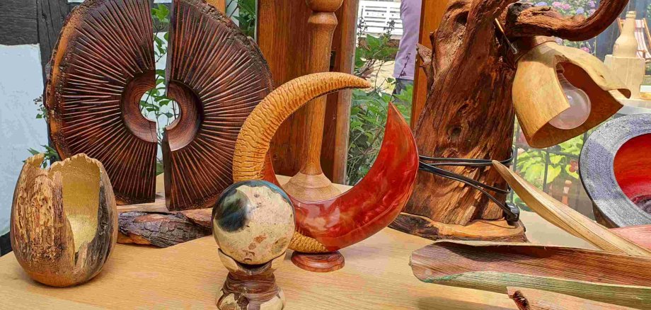 Kombiniert mit farbigem Epoxidharz hat er so interessante Hingucker gestaltet, wie die sichelförmige Skulptur aus Fichte, die durch ihre rote Epoxidhälfte auffällt.