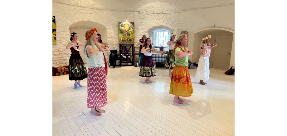 Mit dem passenden Outfit und mit Blumen geschmückt, konnten die Teilnehmerinnen einiges über die Kultur Hawai’i lernen. Dafür stand ihnen eine Auswahl an Hula-Röcken, Haarschmuck und Blumenketten zur Verfügung. Anschließend wurde mit viel Freude und bei herrlicher Musik Hula nach alter hawaiianischer Tradition getanzt.