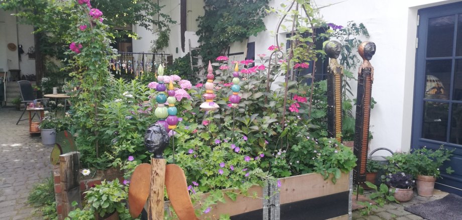 Zum fünften Mal präsentierte Gastgeberin Ute Krueger ihre farbschönen Keramikarbeiten im liebevoll begrünten Innenhof in Wachtberg Arzdorf. Wie jedes Jahr gab es auch dieses Mal neue keramische Kleinigkeiten zu bewundern. Neben Gartenstelen, Zaunkönigen und bunten Anhängern wurden Schneckenhäuser und Keramikblüten geboten.