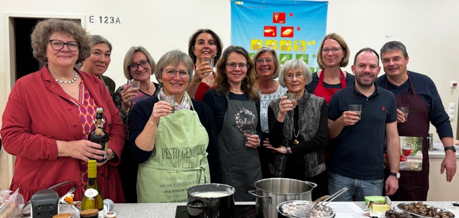 Die Köche und Köchinnen ließen sich die Früchte ihrer Arbeit an einer langen, in den französischen Farben geschmückten Tafel kräftig munden. Es war eine gemütliche Runde mit angeregten Gesprächen, bei denen ein mehr oder weniger kleines Schlückchen Rotwein ein Übriges tat. Für die Teilnehmer – allesamt Mitglieder des Partnerschaftsvereins – bot sich dabei die willkommene Gelegenheit des gegenseitigen Kennenlernens, was sich bei der Durchführung anderer Programme des Vereins sicher als hilfreich erweisen wird.