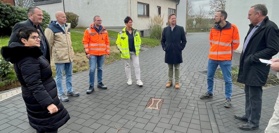 Foto: v.l.n.r.: Alina Ahrens (enewa), Holger Weber, Lutz Ebert, Joshua Dickmeis (Bauamt Gemeinde Wachtberg), Jeannette Herrmann (Beigeordnete Gemeinde Wachtberg), BM Swen Christian, Henry Horn, Tobias Teichner