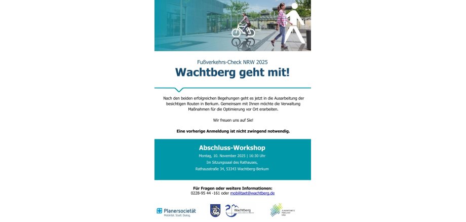 Durch die Unterstützung und die Förderung des Landes NRW im Rahmen des Fußverkehrs-Checks beinhaltet dieser Abschluss-Workshop die Chance, sinnvolle Verbesserungen zu verwirklichen und wichtige Erfahrungen zu machen, um nach und nach auch in anderen Ortsteilen Wachtbergs die Verkehrssituation für Fußgänger zu verbessern. Daher freuen wir uns auf rege Beteiligung.