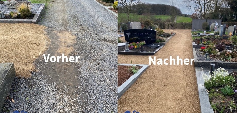 Umso wichtiger ist es, dass Friedhöfe instand gehalten und gepflegt werden. Dafür ist in Wachtberg die Grünkolonne vom Baubetriebshof zuständig, was bei der Anzahl der Friedhöfe in der Gemeinde keine Kleinigkeit ist. Auf dem Berkumer Friedhof wurden gerade die Verkehrsflächen vom alten Split befreit und mit Kalkbrechstein befestigt, einem Belag, der besser mit Rollatoren zu befahren und wenig anfällig für Unkraut ist. Wie man sieht, hat es sich gelohnt.