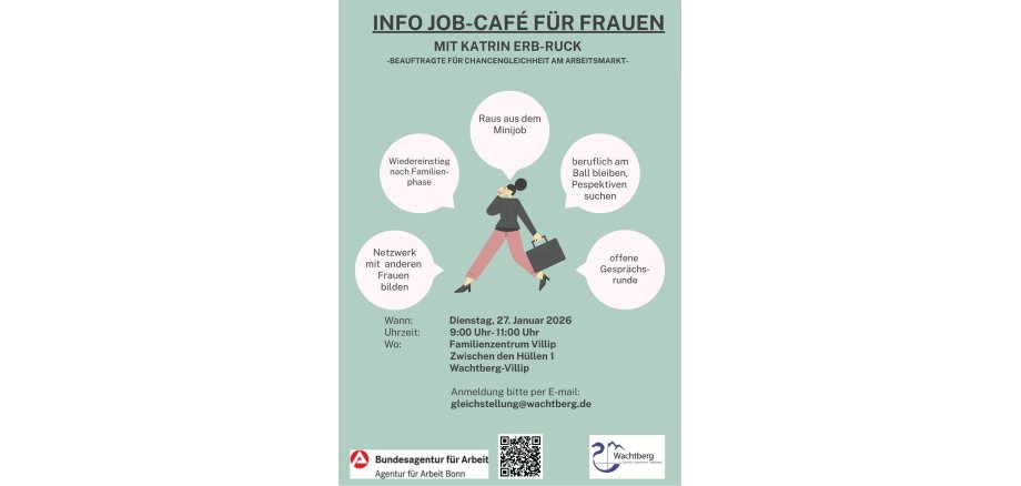 Hierzu laden Sie Katrin Erb-Ruck, Beauftragte für Chancengleichheit am Arbeitsmarkt der Agentur für Arbeit Bonn/Rhein-Sieg, und Bettina Pfahl, Gleichstellungsbeauftragte der Gemeinde Wachtberg, herzlich ein.