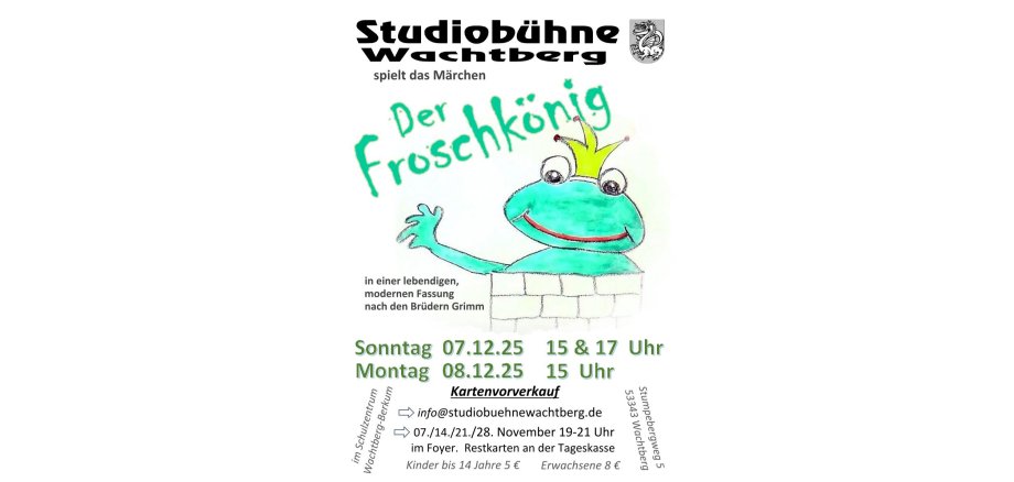 Die Studiobühne Wachtberg präsentiert „Der Froschkönig“ in einer modernen, lebendigen Inszenierung – frisch interpretiert vom engagierten Nachwuchs. Die beliebte Geschichte aus der Sammlung der Brüder Grimm bekommt so eine neue Tiefe und Aktualität.