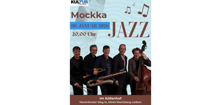 MOCKKA sind: Olaf Heße (Baritonsaxophon), Dave Dörr (Trompete), Peter Scholly (Klavier), Peter Dilling (Kontrabass) und Volker Venohr (Schlagzeug).