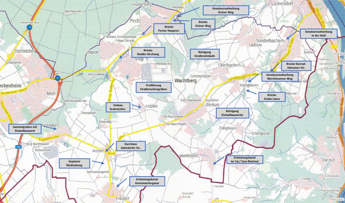 Angesichts zunehmender Starkregenereignisse und Hochwassergefahren setzt die Gemeinde Wachtberg auf eine Reihe von präventiven Maßnahmen, um die Sicherheit der Bürgerinnen und Bürger zu gewährleisten. Durch frühzeitige und umfassende Planung können wir gemeinsam Risiken für unsere Gemeinde minimieren. Im Folgenden finden Sie eine Übersicht über Maßnahme und Angebote der Gemeinde: